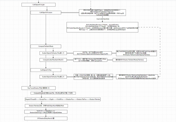————第二次ScatterObjectsToShadowTiles:前面知道了每个Tile的Object数量和Tile的Offset,这里最后主要是把RWShadowTileArrayData[DataIndex]填充了,它的长度是所有Tile的Object数量之和,它的值是ObjectIndex(就是CullObjectToFrustum这步的CopyData的索引)