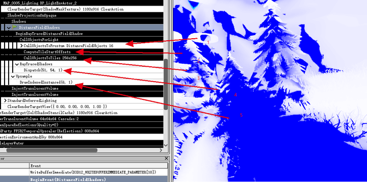2.DFShadow计算 1 2 3 4 5 6 7 8 9 10 11 12 13 14 15 16 17 18 19 20 21 22 23 24 25 26 27 28 29 30 31 32 33 34 35 36 37 38 39 40 41 42 43 44 45 46 47 48 49 50 51 52 53 54 55 56 57 58 59 [numthreads(THREADGROUP_SIZEX, THREADGROUP_SIZEY, 1)] void DistanceFieldShadowingCS( uint3 GroupId : SV_GroupID, uint3 DispatchThreadId : SV_DispatchThreadID, uint3 GroupThreadId : SV_GroupThreadID) { //和其他ComputeShader算法一样,转换DispatchThreadId为屏幕UV和屏幕坐标 uint ThreadIndex = GroupThreadId.y * THREADGROUP_SIZEX + GroupThreadId.x; float2 ScreenUV = float2((DispatchThreadId.xy * DownsampleFactor + ScissorRectMinAndSize.xy + .5f) * View.BufferSizeAndInvSize.zw); float2 ScreenPosition = (ScreenUV.xy - View.ScreenPositionScaleBias.wz) / View.ScreenPositionScaleBias.xy; //深度转换为世界坐标 float SceneDepth = CalcSceneDepth(ScreenUV); float3 OpaqueWorldPosition = mul(float4(ScreenPosition * SceneDepth, SceneDepth, 1), View.ScreenToWorld).xyz; //得到DFTrace的射线起点和终点,其实就是往灯光方向去打射线,和ContactShadow一样 float3 WorldRayStart = OpaqueWorldPosition + LightDirection * RayStartOffset; float3 WorldRayEnd = OpaqueWorldPosition + LightDirection * TraceDistance; //遍历所有的CullObject,先判断射线是否与物体包围盒相交 //IntersectionTimes得到最近交点和最远交点 float2 IntersectionTimes = LineBoxIntersect(...); BRANCH if (IntersectionTimes.x < IntersectionTimes.y) { //如果有相交,就在包围盒内RayMarching,逐步采样距离场,如果值小于一个阈值,代表很接近这个物体了,可以结束循环,此时距离场信息作为阴影的值。如果已经RayMarch超出包围盒也结束循环。 LOOP for (; StepIndex < MaxSteps; StepIndex++) { float3 SampleVolumePosition = VolumeRayStart + VolumeRayDirection * SampleRayTime; float3 ClampedSamplePosition = clamp(SampleVolumePosition, -LocalPositionExtent, LocalPositionExtent); float DistanceToClamped = length(ClampedSamplePosition - SampleVolumePosition); float3 VolumeUV = DistanceFieldVolumePositionToUV(ClampedSamplePosition, UVScaleAndVolumeScale.xyz, UVAddAndSelfShadowBias.xyz); float DistanceField = SampleMeshDistanceField(VolumeUV, DistanceFieldMAD).x + DistanceToClamped; MinDistance = min(MinDistance, DistanceField); float SphereRadius = clamp(TanLightAngle * SampleRayTime, VolumeMinSphereRadius, VolumeMaxSphereRadius); float StepVisibility = max(saturate(DistanceField / SphereRadius), SelfShadowVisibility); MinConeVisibility = min(MinConeVisibility, StepVisibility); float StepDistance = max(abs(DistanceField), MinStepSize); SampleRayTime += StepDistance; // Terminate the trace if we are fully occluded or went past the end of the ray if (MinConeVisibility < .01f || SampleRayTime > IntersectionTimes.y * VolumeRayLength) { break; } } MinConeVisibility = min(MinConeVisibility, (1 - StepIndex / (float)MaxSteps)); } return MinConeVisibility; }